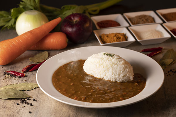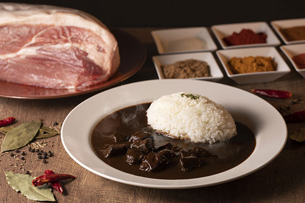歯切れよくやわらかな肉質、脂身の甘味が特長の「鹿児島黒豚」のカシミールカレー。舌ざわりのよい適度な辛さのカシミールカレーに仕上げました。
